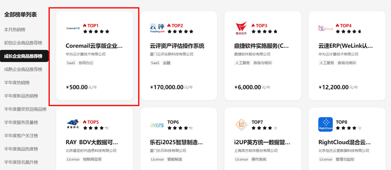 在刚刚发布的云商店7月成长企业商品推荐榜中Coremail云享版企业邮箱荣登第一,得到了用户的充分认可。云商店共同提供的售后服务和Coremail行业一流的产品,在过去、现在和未来都将共同守护用户的每一次邮件投递。