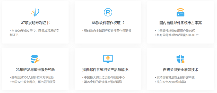 7月登上云商店成长企业商品推荐榜TOP1的Coremail云享版企业邮箱,深耕企业邮箱服务研究23年,拥有大量电子邮件相关专利,Coremail邮件系统通过了国家双重安全认证:中国信息安全测评中心EAL3+安全认证及国家保密局安全保密评中心安全认证。