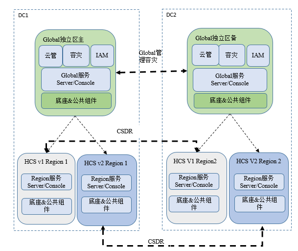 • Global组件/服务:作用在各Region的,比如云管、认证鉴权的IAM服务、跨Region的管理面容灾或业务面的CSDR、跨Region的网络互通CC服务(Cloud Connect)等,在实际使用中面向一朵云下的多个Region