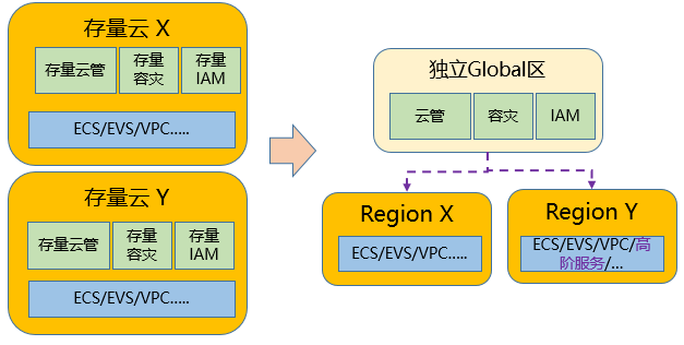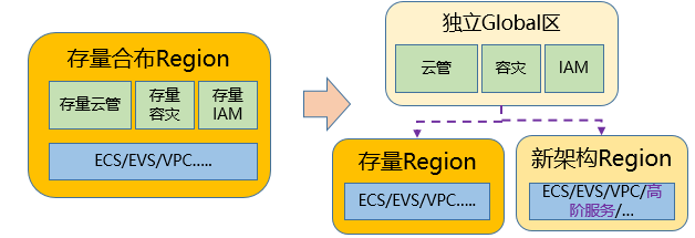 软件的整体架构会随着支持的云服务种类的增多、计算节点的增加规模越来越大,这时,就需要对软件进行架构优化。架构优化会对产品带来巨大的收益,但是可能出现的代价之一,是会让原来架构的存量Region升级更复杂、甚至无法升级,这就要导致不同架构的Region需要在一朵云下进行统一管理。为了解决不同架构的Region并存的问题,基于管理区解耦,可以实现平滑演进和扩容新架构Region。