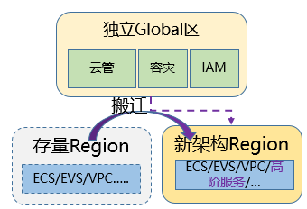 在Region内,为支持滚动升级,VM提供了热迁移或跨AZ的迁移能力;而在一朵云下的多个Region资源池,由于客户数据中心租赁到期、客户存量资源池扩容空间不够等原因,很多客户都有将Region内的VM和存储数据搬迁到另一个Region上的诉求。我们在管理区解耦下的搬迁能力,可以先复用存量数据,将Global组件/服务数据搬迁到Global独立区上,然后再扩容新的业务Region(可以是新架构的业务Region),实现跨Region甚至不同架构的搬迁能力。