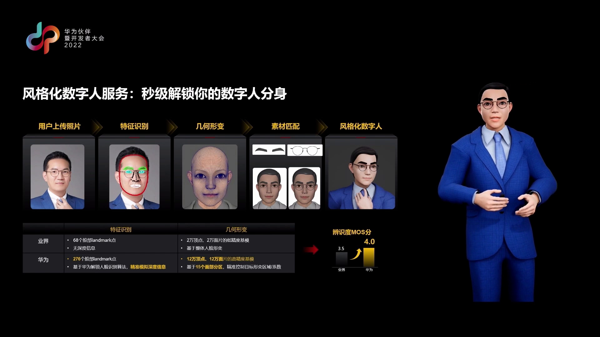 怎样才能快速生成一个数字人呢?华为云提供全场景风格化数字人服务。首先,你只需要上传一张正面照,风格化数字人服务就可以基于华为人脸识别算法精准模拟脸部深度信息,包括276个脸部特征点;然后,通过将基膜和面部分区,结合华为实验室资源的几何形变算法,让模型更像你,采用包含12万个顶点加12万面片的高精度基础模型,基于15个面部分区,能够更加精准控制形变,自动进行材质适配,选取肤色、发型、眉毛、眼睛、胡须等等,生成一个卡通风格数字人,整个制作过程只需五秒就可以生成你的专属数字人。