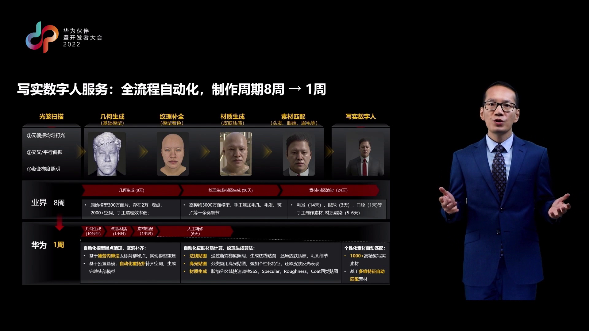 写实数字人制作过程包括,光笼扫描,几何生成、纹理补全、材质生成、素材匹配等环节,流程非常复杂。当前业内如要手工完成,通常需要两个月才能做出一个相对较好的模型,投入巨大,华为提供写实数字人服务,通过光笼拍摄三组100多张各个角度的真人照片,基于从拓普和路线优化自动完成几何模型生成,相比耗时耗力的手工建模,建模时间从六天减少到十分钟。在文理补全材质深层环节,传统的制作方式至少需要一个月时间进行手工打磨。在制作阶段,通过交叉和平行偏振光生成颜色的贴图自动完成模型着色。基于梯度照明生成法线和材质贴图,让皮肤的质感更加自然。相比传统的手工制作方式,制作周期从30天缩短到一小时。