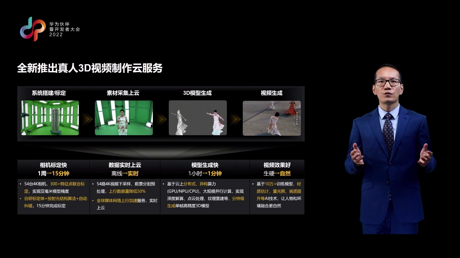 华为云全新推出云上真人3D视频制作服务摄影棚拥有业界领先的高精度拍摄系统,采集拍摄对象每个角度的色彩和深度信息,通过华为自研标定体和投射光结构算法,标定过程只需要15分钟。采集后的数据通过4K视频下采样前景分割预处理,使上行数据量降低50%,带宽降低到几百兆,并提供全球媒体网络上行加速服务,实现数据实时上云。