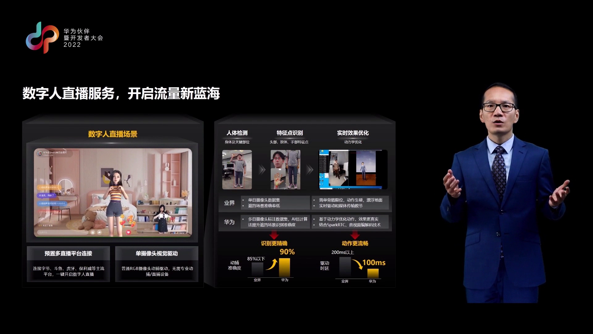 第一个典型场景就是直播,当下各类直播非常火爆。刘根宏的健身直播当场观看人数超过4400万人次。大家可以想象一下,如果把直播和数字人结合起来,主播和每个用户都有一个数字人,观众可以和主播在同一个虚拟空间互动,唱歌跳舞,跟千万个刘根宏女孩一起健身,让互动的体验更有乐趣。华为云数字人直播服务将这种场景变为可能,通过普通摄像头实现对人体动作和表情的高精度捕捉,让数字人的驱动更加真实简单,让人人都可以便捷的使用自己的数字人。采用有深度信息的人体特征点训练数据集和识别算法,让准确度提升至90%,同时结合华为云强大的18个RTC服务,驱动时延低于100毫秒,动作更加流畅。
