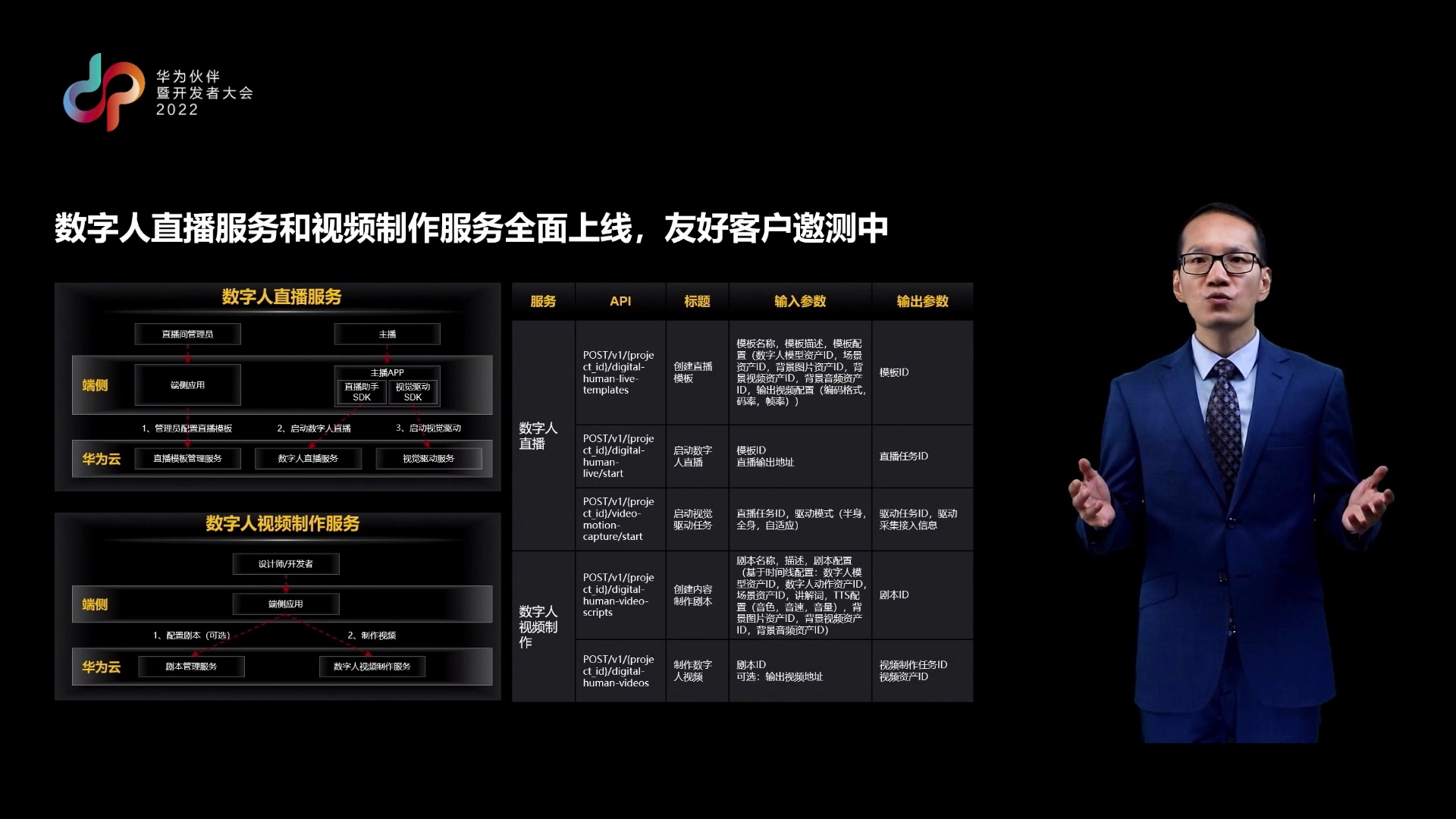 第二个业务场景是数字人视频制作,在教育课件、新闻播报、展厅讲解等场景中,存在大量的视频制作的需求;并且内容频繁变化,依靠人工录制,耗时耗力。数字人视频制作服务,完美地解决了问题,无需真人驱动,用户只需要进行数字人选型,课件配置,讲解词配置就可以让数字人动起来,快速生成讲解视频,通过提取多元的语音特征,数字人口型准确度达到95%以上,同时,基于600多个表情肌,可以实现音频特征和表情的精确匹配,深沉的表情更加真实细腻,甚至可以表达丰富的微表情,对比传统的单帧拼接的方式,华为云通过计算连续帧的插损值实现口型表情平滑变化,让数字人表情更加连续自然。