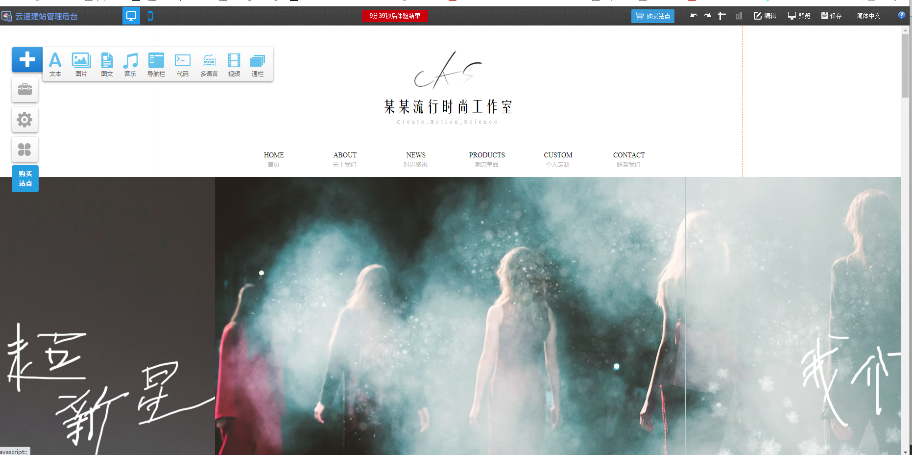 ,可以在页面添加“文本、图片、图文组合、音乐、导航栏、代码,多语言、视频以及通栏”多项内容,且页面中已有的文字均可以修改,鼠标移动至文字处,双击即可编辑;