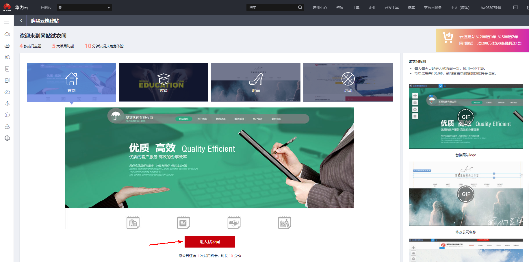 首先,以模板建站为例,云速建站提供“试衣间”功能,可一键免费体验: