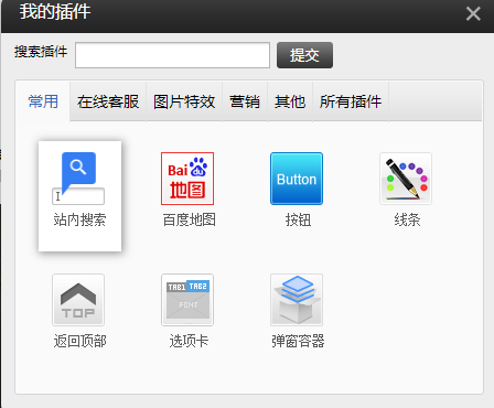 ,弹窗展示网站常用插件,如“站内搜索框、地图功能、返回顶部按钮、选项卡等”,还有在线客服、图片特效、营销等其他功能插件。