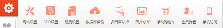 ,弹窗展示“网站设置、SEO设置、背景设计、数据库备份、多语言站点、图片水印、浮动购物车、会员弹窗、手机访问”,可以自行添加页面优化/用户互动功能;