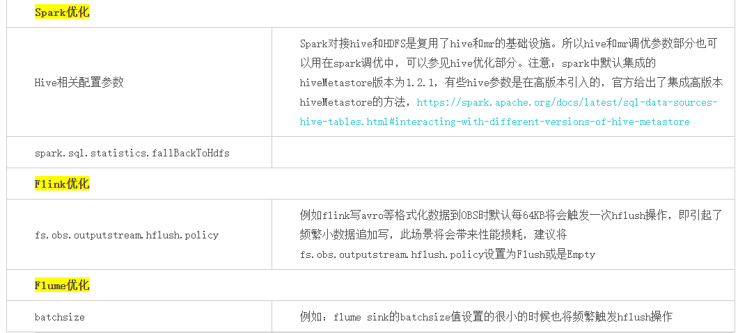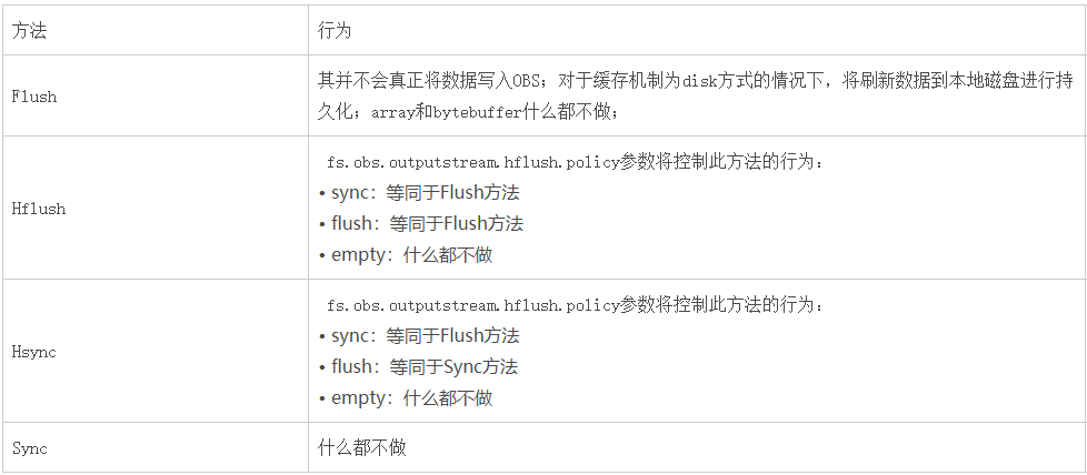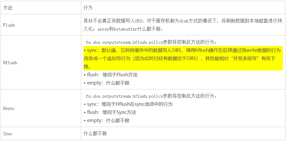 注意:hadoop-obs 46 版本才开始支持 fs.obs.outputstream.hflush.policy 策略,之前的版本实现机制等同于 fs.obs.outputstream.hflush.policy=Sync 的行为。