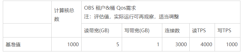 在基于 OBS 的大数据存算分离解决方案中 OBS 侧 QOS(主要是读写带宽)的评估没有一个准确的计算公式,也因业务场景的复杂性导致难有一个一以贯之的公式。根据经验和理论的沉淀现阶段能够采用的 OBS QOS 评估方法如下: