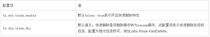 注:快速删除开启后需要配合 OBS 服务的生命周期特性,定期删除 fs.obs.trash.dir 目录中的数据