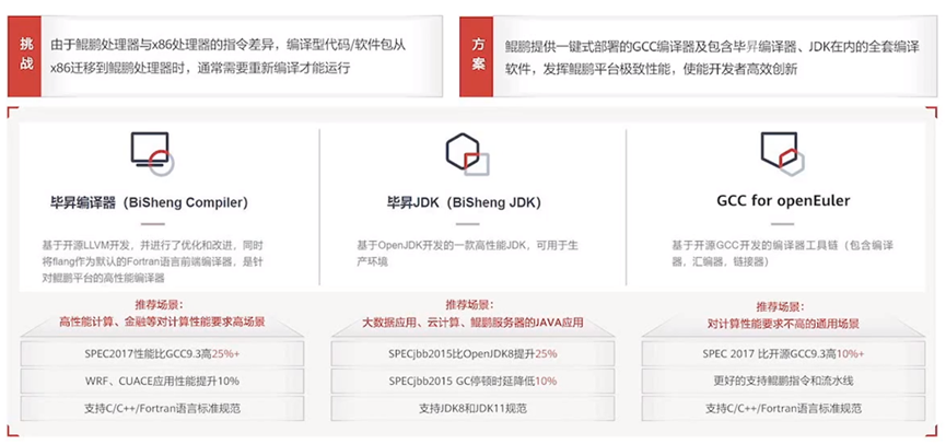 同时,鲲鹏也提供了高性能的编译器,例如毕昇编译器,它适合于高性能计算,金融等对于计算能力有较高要求的场景;毕昇Jdk,则适合大数据应用,云计算,鲲鹏服务器的Java应用;GCC for openOuler适合计算能力要求不高的场景。