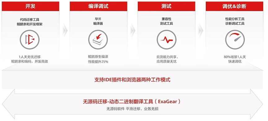 在各行业基于鲲鹏计算产业生态加速数字化转型的道路上,由传统架构向鲲鹏平台的软件迁移、以及基于鲲鹏平台的原生开发都是非常关键的环节。为了帮助开发人员更快熟悉鲲鹏平台,更加便捷、高效地完成不同计算平台之间的应用迁移,鲲鹏在2019年面向合作伙伴和广大开发者发布了一站式开发套件DevKit1.0,覆盖有源码与无源码两大场景下的无忧迁移:针对源码应用,提供代码迁移、编译调试、性能分析、系统诊断等工具套件,确保应用的快速迁移以及迁移之后的性能最佳;针对部分找不到源码的存量应用,通过动态二进制指令翻译软件ExaGear,“零代码”、“低损耗”的实现应用迁移。