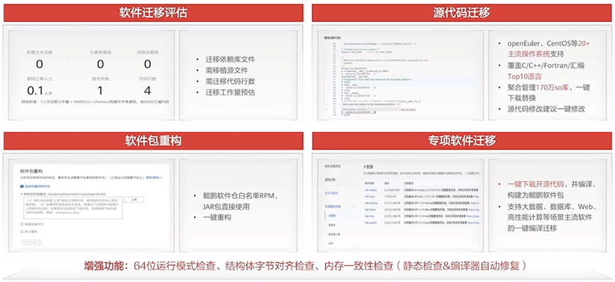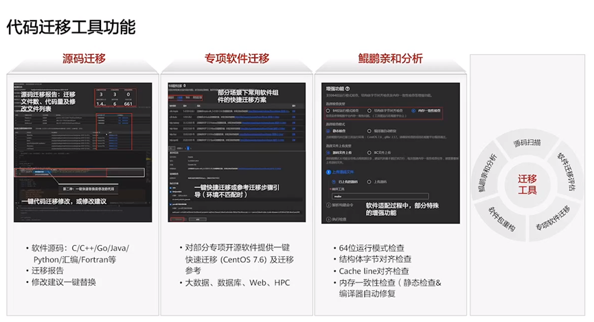 鲲鹏迁移功能是它的传统强项,在近年,华为团队更是进一步加强了这个功能。软件评估让开发者在迁移前就可以清楚工作量,以此合理的安排计划。源代码迁移支持了绝大多数的操作系统和编程语言。软件包重构可以一键重建jar包和RPM包。而专项迁移则可以对于常见的开源软件一键编译构建,大大减少了工作量。