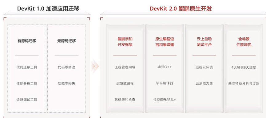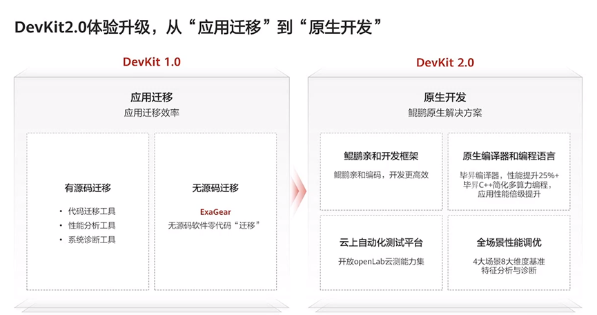 随着应用迁移的不断深入,越来越多的合作伙伴基于鲲鹏进行原生开发。如何高效的开发出鲲鹏平台亲和、发挥鲲鹏架构最大优势的新软件,成为了DevKit升级的核心,DevKit2.0也应运而生,面向全研发作业流程全新推出了鲲鹏亲和开发框架、性能优化后的毕昇编译器、毕昇C++语言、增强的云上自动化测试服务、全场景性能调优等能力,让开发者更便捷高效的基于鲲鹏进行原生开发。