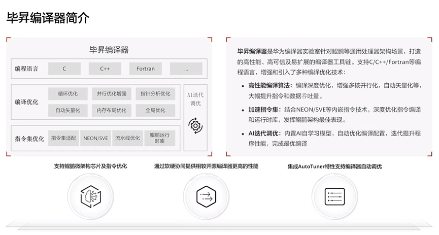 毕昇编译器是华为编译器实验室针对鲲鹏等通用处理器架构场景,打造的一款高性能、高可信及易扩展的编译器工具链,增强和引入了多种编译优化技术,支持C/C++/Fortran等编程语言。