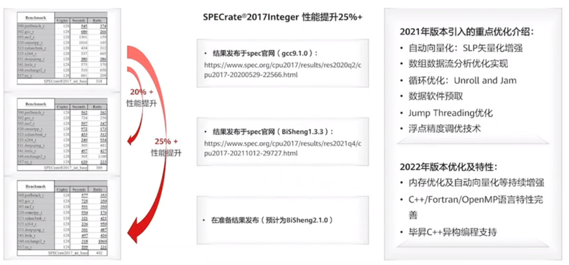 毕昇编译器取得了最大的优化进展,同时也有许多重点优化技术。在毕昇编译器1.3版本发布了一个新的跑分,相比GCC的开源编译器,有了将近20%的性能提升。在2021年年底,毕昇编译器发布了2.1.0版本,在原有基础上又进一步提升了性能,当前,相比业界开源的编译器,可以达到25%以上的性能提升。在2021年的版本上,华为重点引入了一些非常关键的优化,包括向量化的优化,内存和循环的优化,同时也在数据预取和精度调优等方面也有了极大的优化。