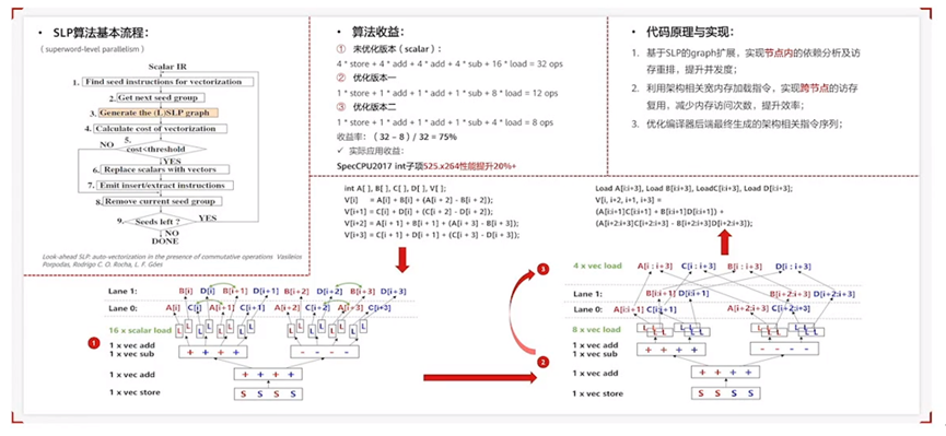 在毕昇编译器自动向量优化——SLP矢量化增强等方面。鲲鹏处理器上面除了基本的浮点和定点功能外,还引入了向量硬件单元,毕昇编译器在其上面做了很多的优化增长,尤其是基于鲲鹏的向量指令集做了很多向量自动化的优化。自动向量化主要分为两类,第一类是循环向量化,第二类是基于基本块和基于非循环的SLP矢量化。毕昇编译器在SLP向量化上面做了很多的优化增长,主要是从算法维度扩展了SLP优化上本身节点内和跨节点的依赖分析。使得矢量指令集能够有一个更好的编译生成效果,给CV类应用和AI类应用带来很大的提升。