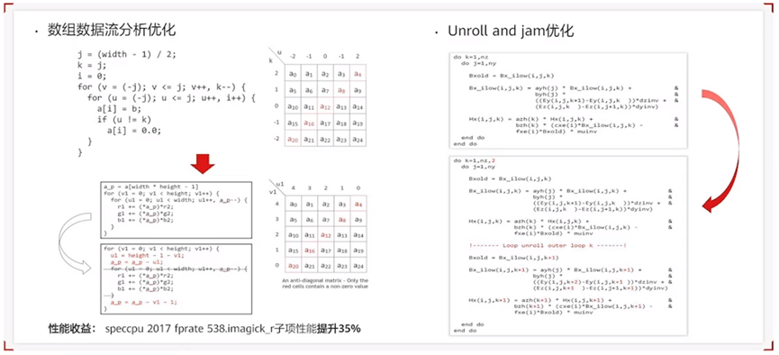 在内存及循环优化方面,鲲鹏主要给大家带来了基于数组数据流的优化分析。在2021年,毕昇编译器引入了很多的循环优化,例如Unroll and jam 优化,这个优化主要把外层循环展开,然后和内层循环做一个合并,使得其内层循环的并行化做进一步的加强。