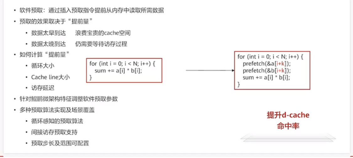 在数据软件预取方面,即插入一些预取指令,在内存中读取一些需要预取的数据。尤其针对一些内存访存密集的应用,这些应用会在访存中存在一些阻塞。所以软件预取是在硬件预取的基础上,针对程序中的代码,取得一些提前量的优化。开发者在计算提前量的时候,需要考虑循环的大小,硬件访存的硬件带来的迟延等现实因素。而毕昇编译器针对当前情况下的软件预取的配置参数做了很多的优化,尤其是引入了多种预取算法的实现,以及对多种不同的场景进行了一番覆盖。毕昇编译器引入了循环感知的一些预取算法,在由于硬件预取无法对所有的预取场景进行覆盖的情况下,对硬件预取进行了增强。