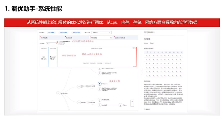 调优助手通过系统化组织和分析性能指标、热点函数、系统配置等信息,形成系统资源消耗链条,引导用户根据优化路径分析性能瓶颈,并针对每条优化路径给出优化建议和操作指导,以此实现快速调优。通过精准分析、全面调优,软硬件整合释放最佳性能。