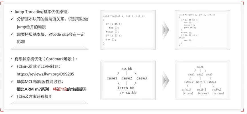从下面的图可以看出Jump Threading优化的原理主要是通过分析基本块间的控制流关系,合并一些基本块的跳转。同时毕昇编译器在有限状态机的场景下,针对Jump Threading进行了一个额外的增强,可以将原来复杂的switch语句块变成一个直观清晰的跳转分布语句块。