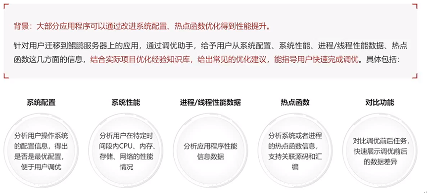 系统性能分析:针对基于鲲鹏处理器的服务器进行性能分析和优化,根据服务器的软硬件信息和性能数据,定位到系统瓶颈点及热点函数。