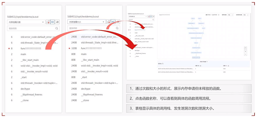 分析应用程序存在的内存泄漏点(包括内存未释放和异常释放),得出具体的泄漏信息,并支持关联出调用栈信息和源码。实时跟踪应用程序运行期间系统层、应用层、分配器层的内存消耗情况。分析发生OOM时的进程内存状态、系统内存状态和调用栈信息。