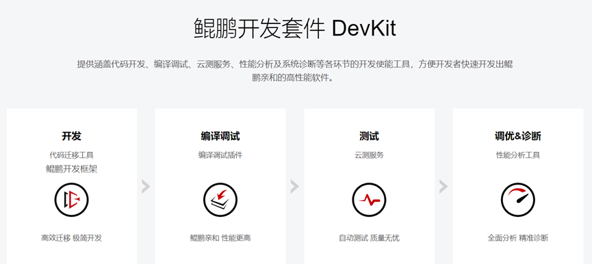 鲲鹏开发套件DevKit是一站式开发套件,能够帮助鲲鹏开发者进行极简开发。目前DevKit在开发,编译调试,测试以及调优诊断等环节支撑用户的开发活动,提高开发效率。在开发环节,DevKit可以对用户的历史源码进行跨平台迁移检查,帮助用户完成源码修改等操作。同时,用户在开发软件应用时,开发套件DevKit可以对用户代码进行亲和性检查,根据鲲鹏架构的特点,对用户源码提供针对性修改建议,帮助开发者开发出在鲲鹏架构运行更优的应用。