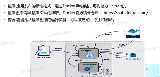 镜像:应用发布的标准格式,通过Dockerfile描述,可构建为一个tar包;