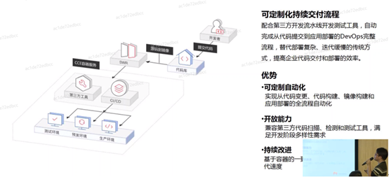可定制化持续交付流程:配合第三方开发流水线开发测试工具,自动完成从代码提交到应用部署的DevOps完整流程,替代部署复杂、迭代缓慢的传统方式,提高企业代码交付和部署的效率。