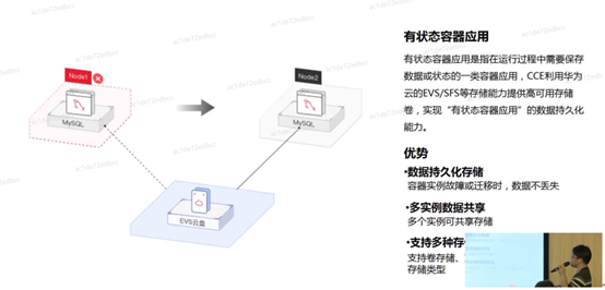 有状态容器应用:有状态容器应用是指在运行过程中需要保存数据或状态的一类容器应用。CCE利用华为云的EVS/SFS等存储能力提供高可用存在卷,实现“有状态容器应用”的数据持久化能力。