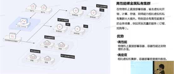 高性能裸金属私有集群:在物理机上直接部署容器,省去虚拟化开销,计算、存储、网络能力相比虚拟机私有集群大大提升,特别适合有高性能需求的业务场景。