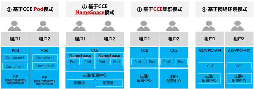 基于CCE NameSpace模式,不同租户的业务微服务部署在同一个CCE集群中的不同的NameSpace中,支持资源的逻辑隔离;不同租户的路由、升级等策略部署到同一个配置中心的不同的配置组中,支持策略逻辑隔离;