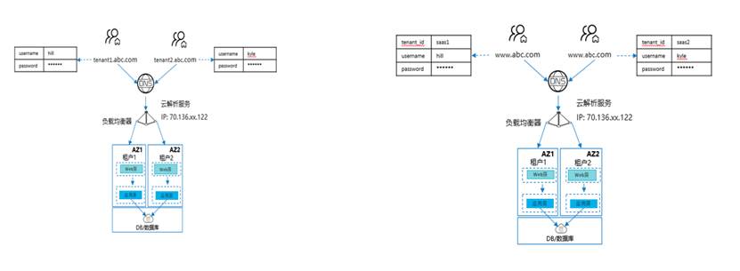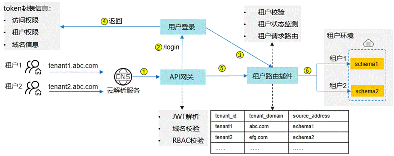 - 方案二:采用统一域名,通过不同请求参数,如增加租户字段,进行租户区分,将租户请求路由到后端应用。