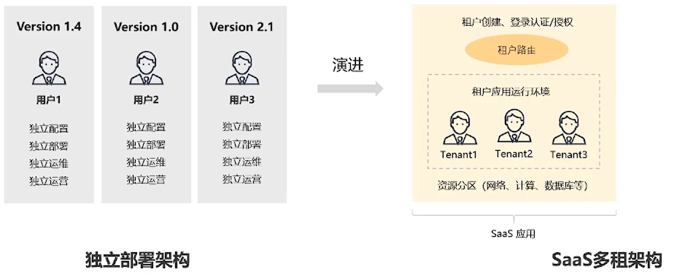 独立部署架构需要独立配置、独立部署、独立运维、独立运营。企业发展前期可以采取这种模式形成竞争力,但企业成长到一定阶段后,还采用这种交付模式,会对企业的发展产生瓶颈。这时我们就要往 SaaS 多租户架构的方向发展。SaaS 多租户架构会提供统一登录鉴权机制、统一运营运维、资源共享。