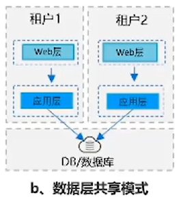 租户应用环境共享模式,在应用层完全共享,在数据层通过数据库实例进行隔离,保证在每一个租户都有一个稳定的、可靠的数据库请求的能力,能够处理一些高并发的请求。比较适合,OA 的SaaS 化系统,CRM 的 SaaS 化系统。