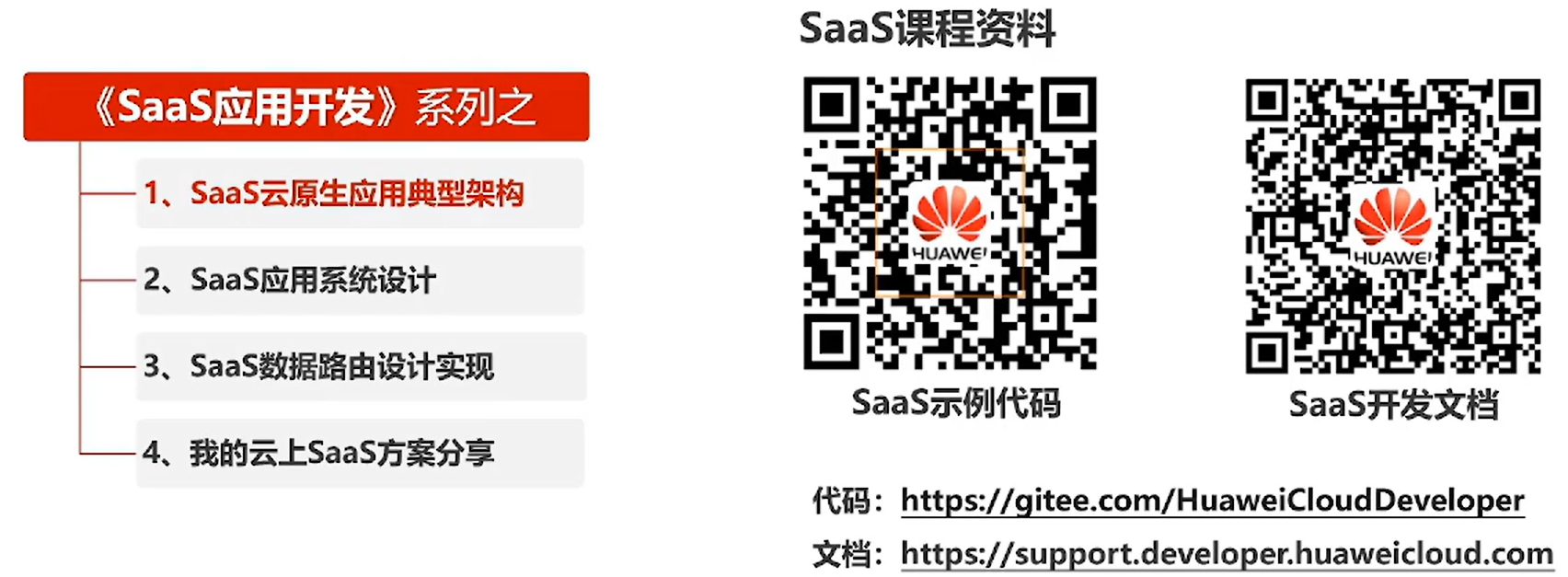 另外,华为的开发者技术服务团队,为广大的开发者精心准备了课程资料,包括示例代码和开发文档,在示例代码里面会提供 SaaS 化的一个项目,作为大家的技术支持和参考。在开发者文档中会提供详细的方案,包括多租户的创建和多租户的设计方案,以及数据存储方案,他会配合示例代码共同支持快速的完成云上的原生的 SaaS 架构的构建。