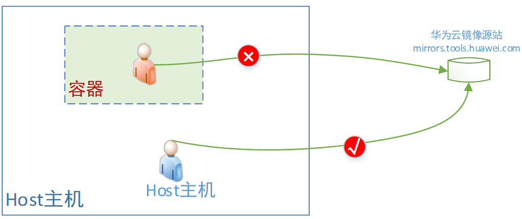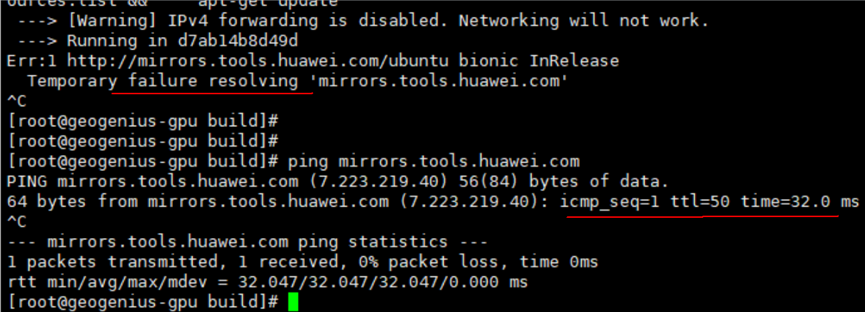 具体使用场景为,容器中用apt-get连华为云的镜像源(mirrors.tools.huawei.cn)来安装软件包。但是容器中报错:Temporary failure resolving 'mirrors.tools.huawei.cn'。