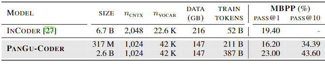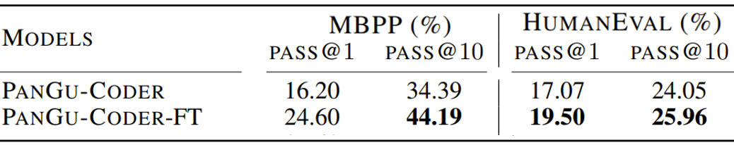 表4 PanGu-Coder: 3亿模型Fine-tune结果