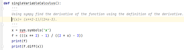 Input: Using sympy find the derivative of the function using the definition of the derivative.f(x)= (x**2-1)/(2*x-3).