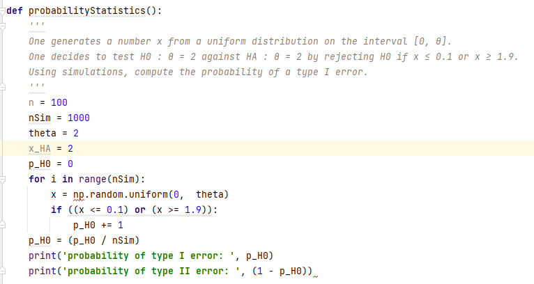 Input: One generates a number x from a uniform distribution on the interval [0, θ].One decides to test H0 : θ = 2 against HA : θ = 2 by rejecting H0 if x ≤ 0.1 or x ≥ 1.9.Using simulations, compute the probability of a type I error.