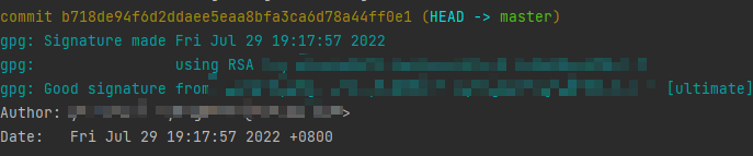 看git日志,能够看到提交的信息已经有gpg加密信息了(配置gpg前提交的内容不会自动附加gpg,需要撤回重新提交才会附加gpg)