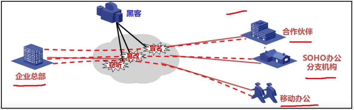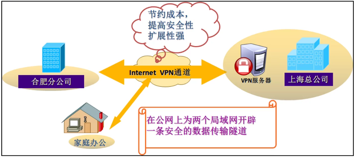 • VPN可以建立隧道,可以帮助我们通过外网访问到企业的内网,也可以从企业的内网到另外一个企业的内网,等等,只要有需求,就可以建立一个隧道,来解决需求。同时虽然这个隧道在公网上传递,但是他是安全的,就是运营商也看不到,因为这是加密的,我们可以选择高强度的加密方式保证数据的安全传输。
