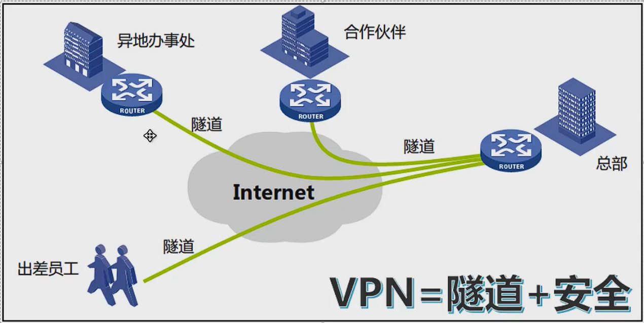 • 我们知道一个企业,他肯定是内网的,我们如何从一个内网接入到另外一个内网,这就是我们要学习的VPN的一个核心技术点,隧道。