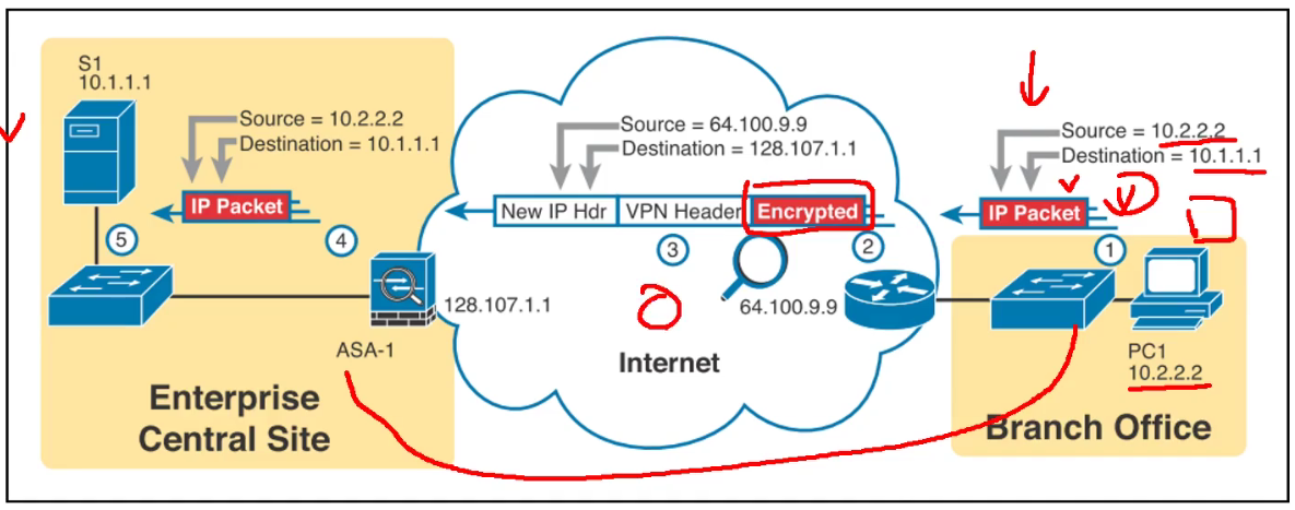 • 比如我们右边的设备,从10.2.2.2发送到10.1.1.1,正常请求到公网就会被丢弃(公网没有私网路由),所有我们通过VPN技术先进行加密(IPsec,AH,ESP),加密后就是密文,看不到是什么类型的数据包,再加上VPN头部和新的IP头部(包含源地址和目标地址),中间所有的公网设备都通过目标IP进行查找路由转发,到达对方的设备后,在进行剥离VPN相关的报头,然后看到真正要找的目标,回包也是同样的操作。