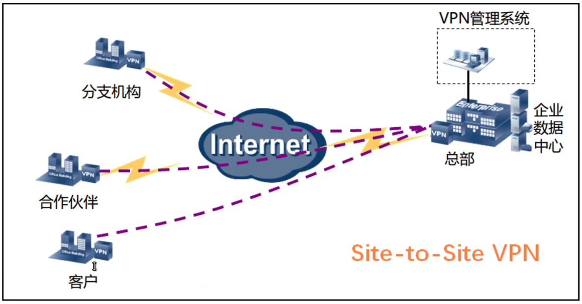 • 在没有VPN之前,内网之间要进行互访,依靠运营商拉的专线(单独拉的线路)(价格贵,灵活性和扩展性不行)