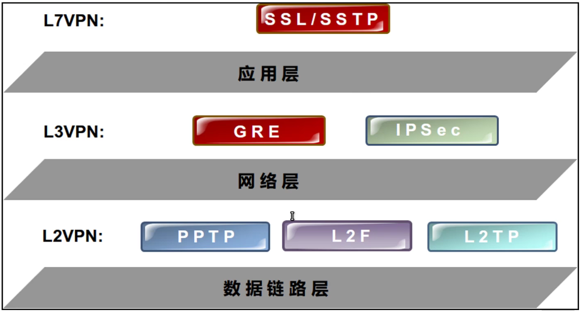 • 分为二层VPN(PPTP,L2P,L2TP),三层VPN(IPsec,GRE)和七层VPN(SSLVPN)。